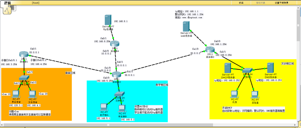按图所示连接好实验拓扑图,并规划相应计算机的IP地址,通过DNS服务器将web服务器的域名解析为ip地址.通过DHCP服务器为局域网中的机房和实验室配置自动配置地址,默认网关等信息